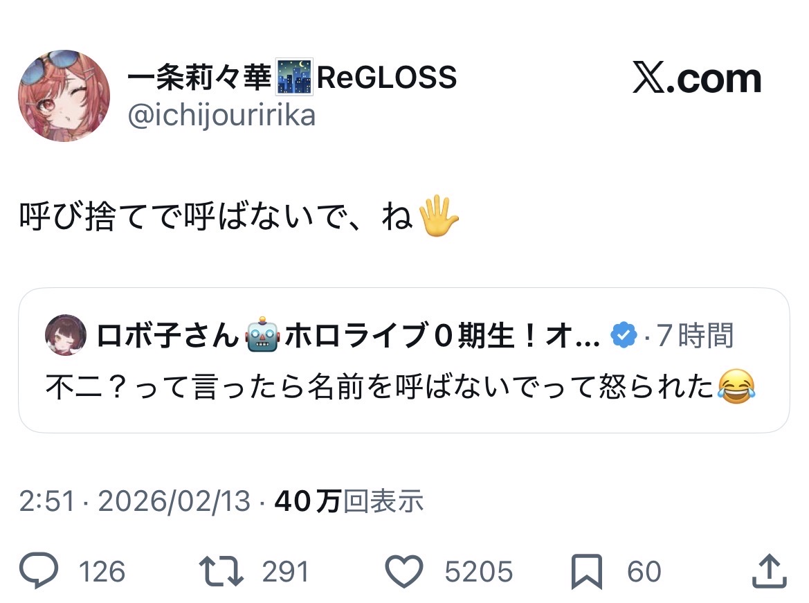 | … | 3026/02/13(金)11:08:43No.1401499508そうだねx1>>当人ならともかく何で無関係の第三者に呼び方強制されなきゃいけないのん? |