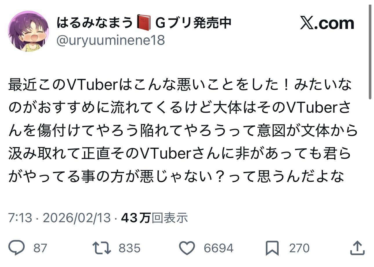 | … | 826/02/13(金)13:23:25No.1401537790そうだねx4Vtuber用のXのサブ垢作ってるけどそんなポストおすすめにも流れてこないんだけどどんなTL構築してんだろ |