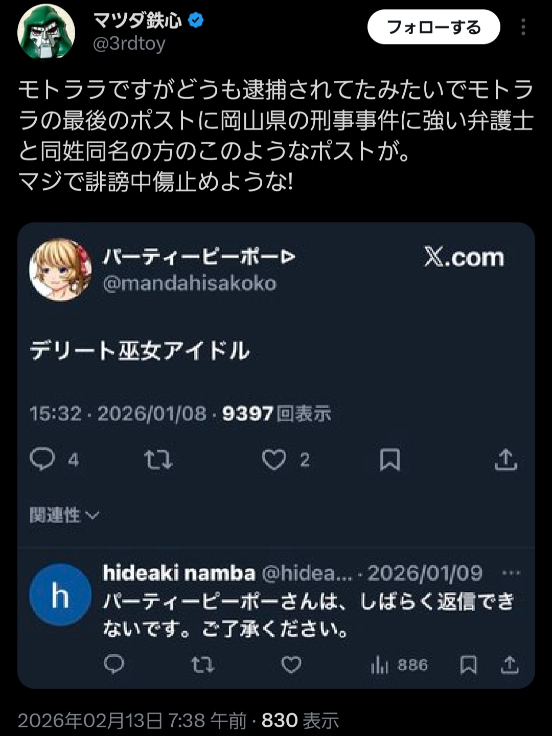 | … | 2026/02/13(金)15:29:19No.1401570921そうだねx26>モトララは銀行口座の転売で逮捕らしい |
