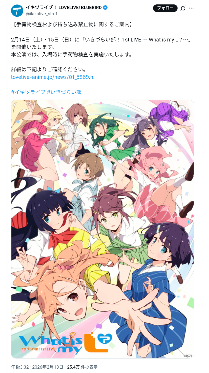 | … | 5026/02/13(金)19:46:55No.1401644097+ラブライブはライブ規制緩めたらどんどん治安悪化していくし運営の対応も悪くなっていってると聞く |