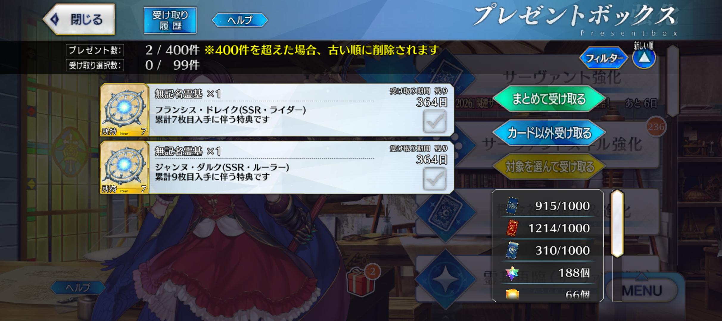 | … | 27026/02/13(金)23:29:38 ID:IEfK62GYNo.1401732143+>バレンタインプレゼントがマスターの戦力にならない時空でよかった |