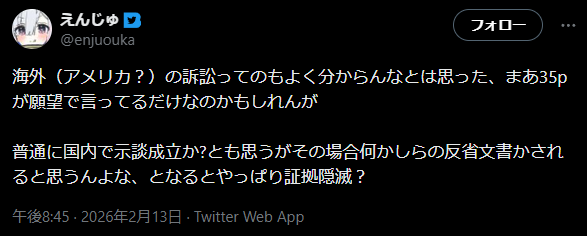 | … | 3026/02/14(土)00:23:42 ID:VOeLXWtANo.1401751854+>かつてのニコ動あたりのノリで海外法人に馬鹿やって法律で殴られました |