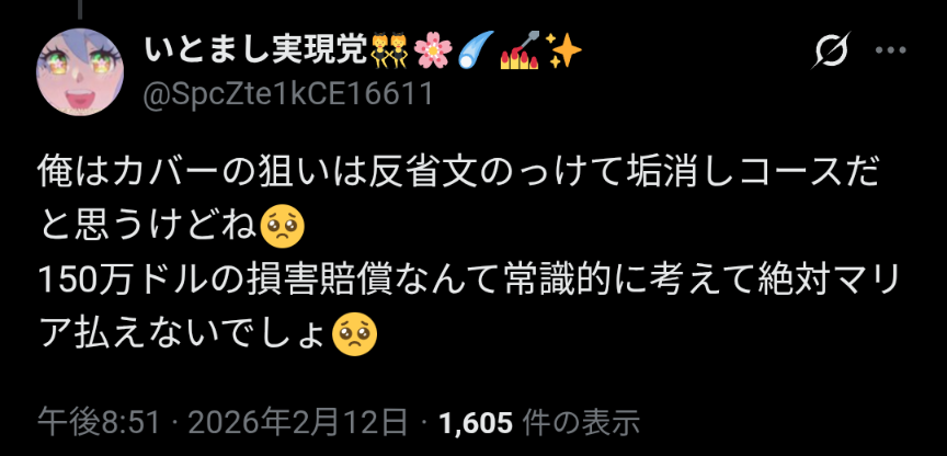 | … | 72026/02/14(土)03:05:06 ID:yKKjeeBkNo.1401781056+>>>>賠償金払えませんってなった時点で色々詰んでアンチ活動やる余裕もなくなると思う |