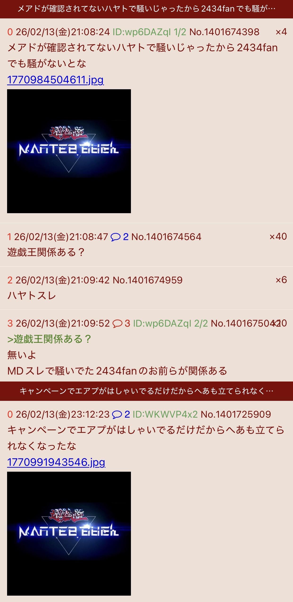 | … | 8126/02/14(土)01:02:48No.1401763249そうだねx31つのスレでメアド晒したとしてそれを他のMDスレでもハヤトだ!って連呼するのは理屈がよく分からないんだよな |