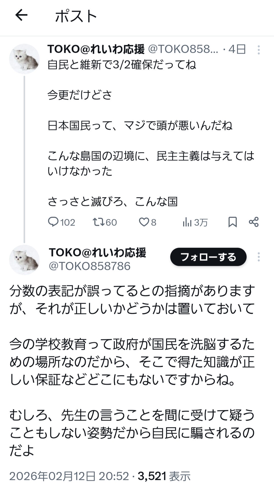 | … | 8826/02/14(土)07:44:19No.1401798414+>>日本の教育真面目に受けたら本当に自民に寄るのかは置いといて |