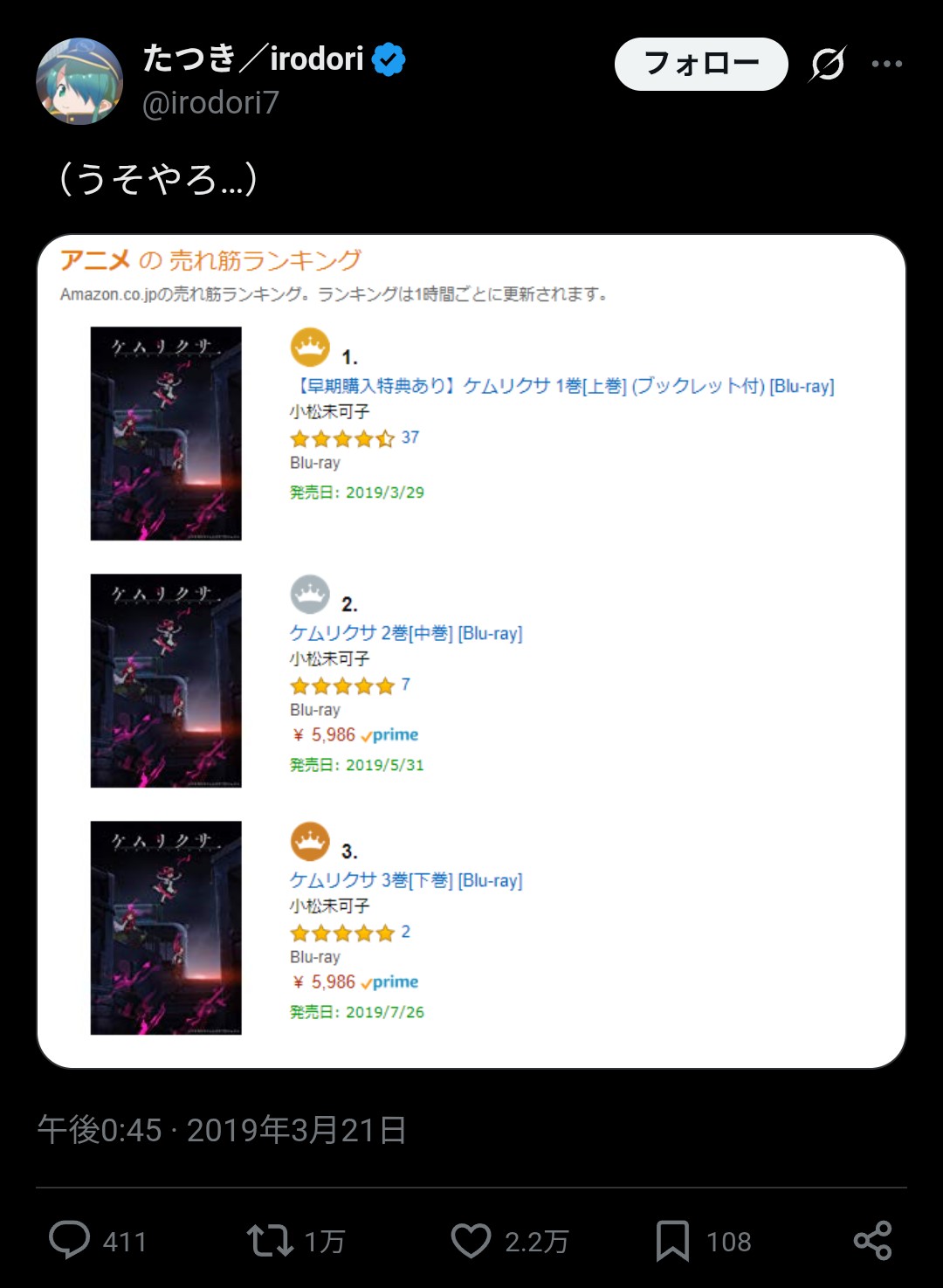 | … | 40326/02/14(土)11:20:59No.1401837950+ケムリクサグッズが大して出なかったのってたつきが暴れたんだろうなって |