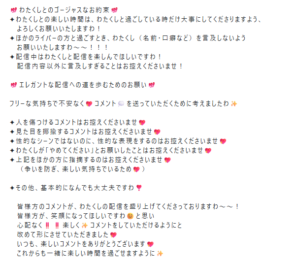 ・私に関連する話題の中で、他のライバーや活動者の方を攻撃したり、誹謗中傷したりする言動は厳にお控えください。