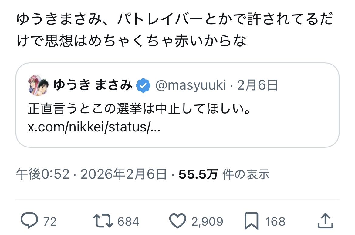 | … | 8026/02/14(土)16:38:07No.1401922944+>どこを支持するかは自由だけど選挙を否定したら民主主義陣営じゃないよ |