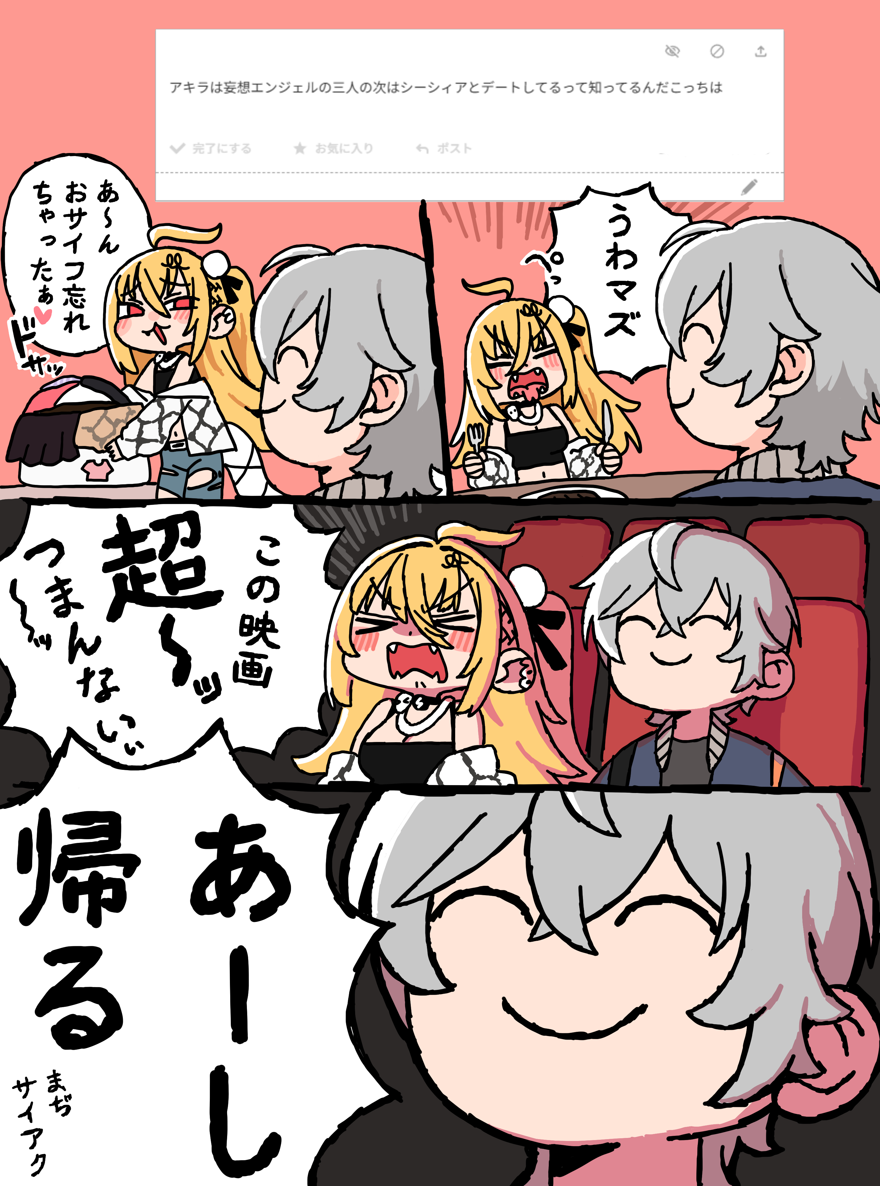 | … | 8226/02/14(土)19:32:36No.1401984623+シーシィアと映画観に行くイベントあるけど普通に奢らされそうンナね |