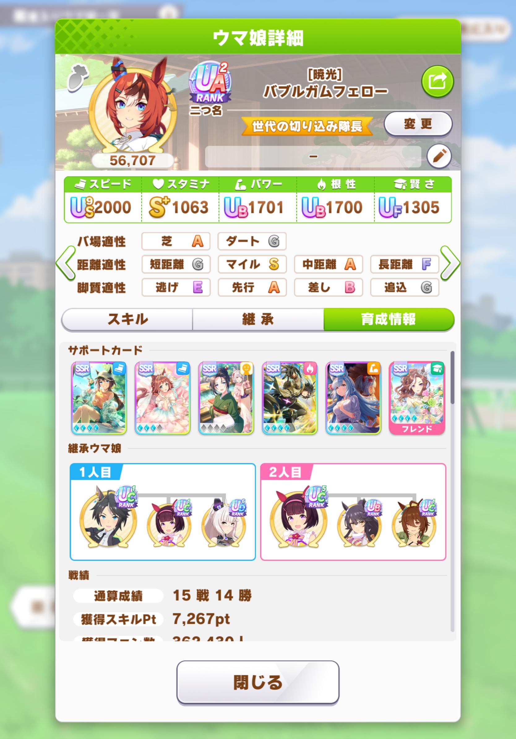 | … | 2926/02/14(土)19:07:05 ID:3.CNAesoNo.1401973883+>>育成開始から1回目の継承まで時間測って >>そのタイミングでおまかせを止める >>これくらいです >クラフトさんもコレでしたねぇ >たまにアラーム鳴るタイミングで離席しちゃって悲しいことになります クラフトさんはアプデでダービー出たいとかじゃなければ解消されましたね |