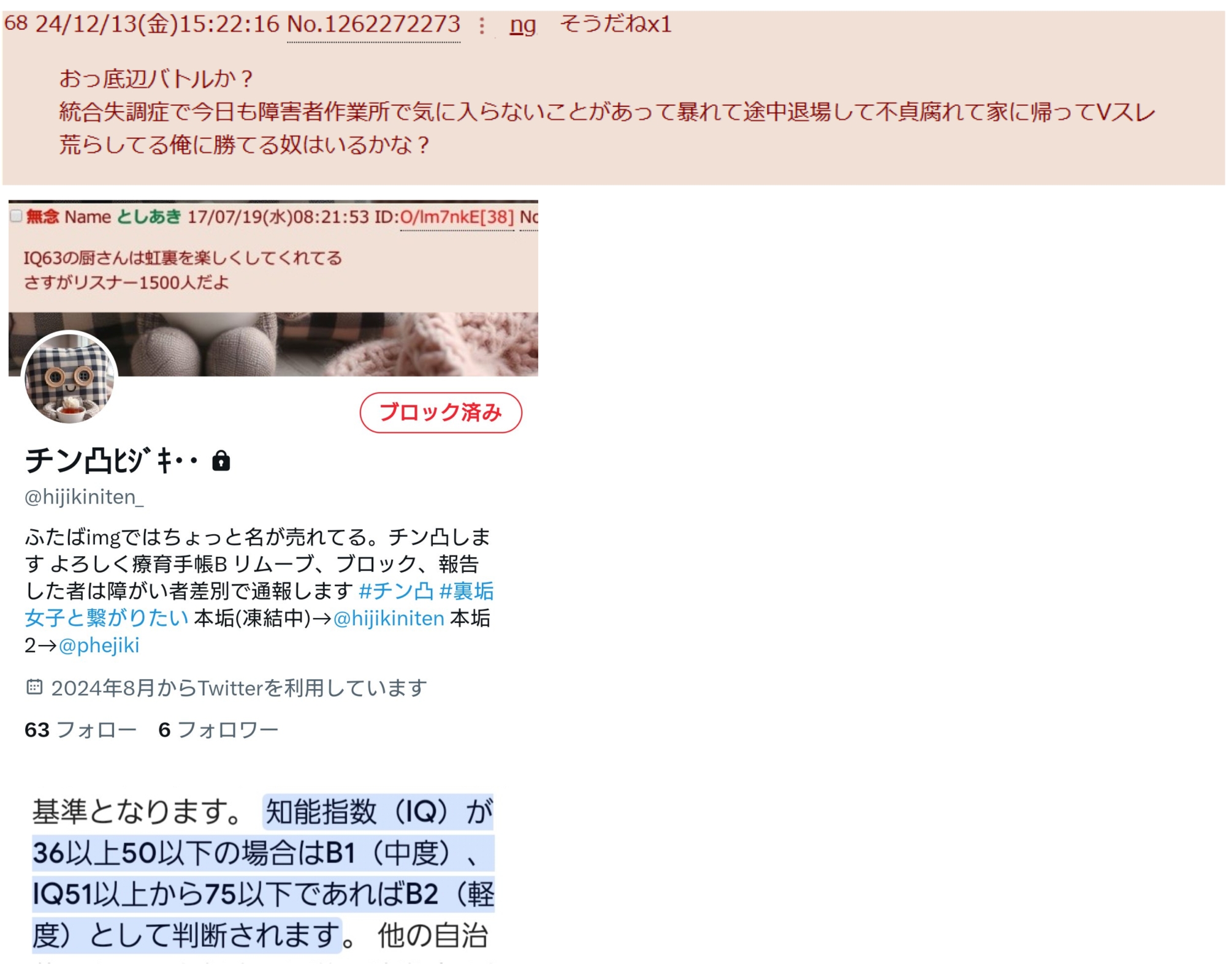 | … | 9726/02/14(土)20:04:50No.1401998706そうだねx3引きこもりの境界知能がネットという武器を持ってしまい他者に迷惑をかけ続けて更生の機会を失うのはマジで現代社会の闇 |