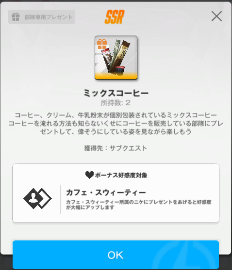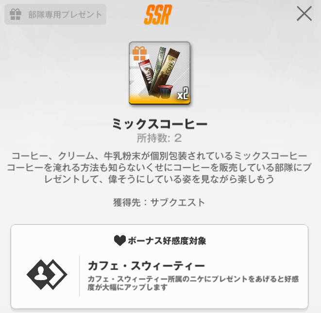| … | 7426/02/14(土)20:25:10No.1402007430そうだねx1>好感度アイテムのテキストが自販機のコーヒーを飲ませるしか能のない連中に本当のコーヒーを分からせてやれみたいな文章で笑った覚えがある fu6295907.png これか |
