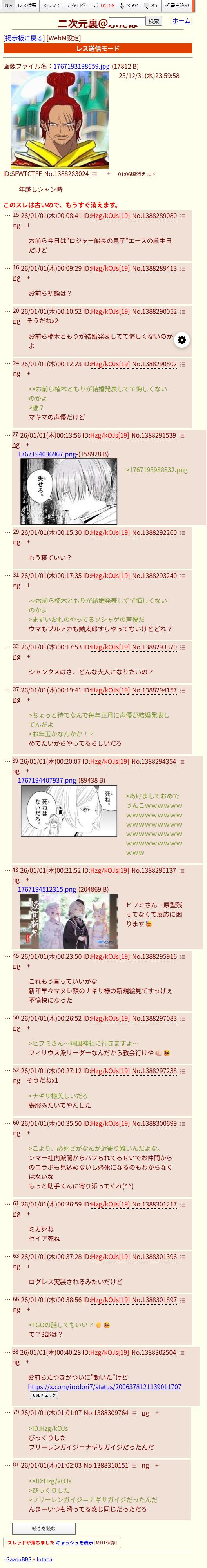 | … | 33126/02/14(土)23:39:40No.1402094029+>シャンクスレ、少なくともグロ連投時代に比べたらちょっと復活したんだよな。 |