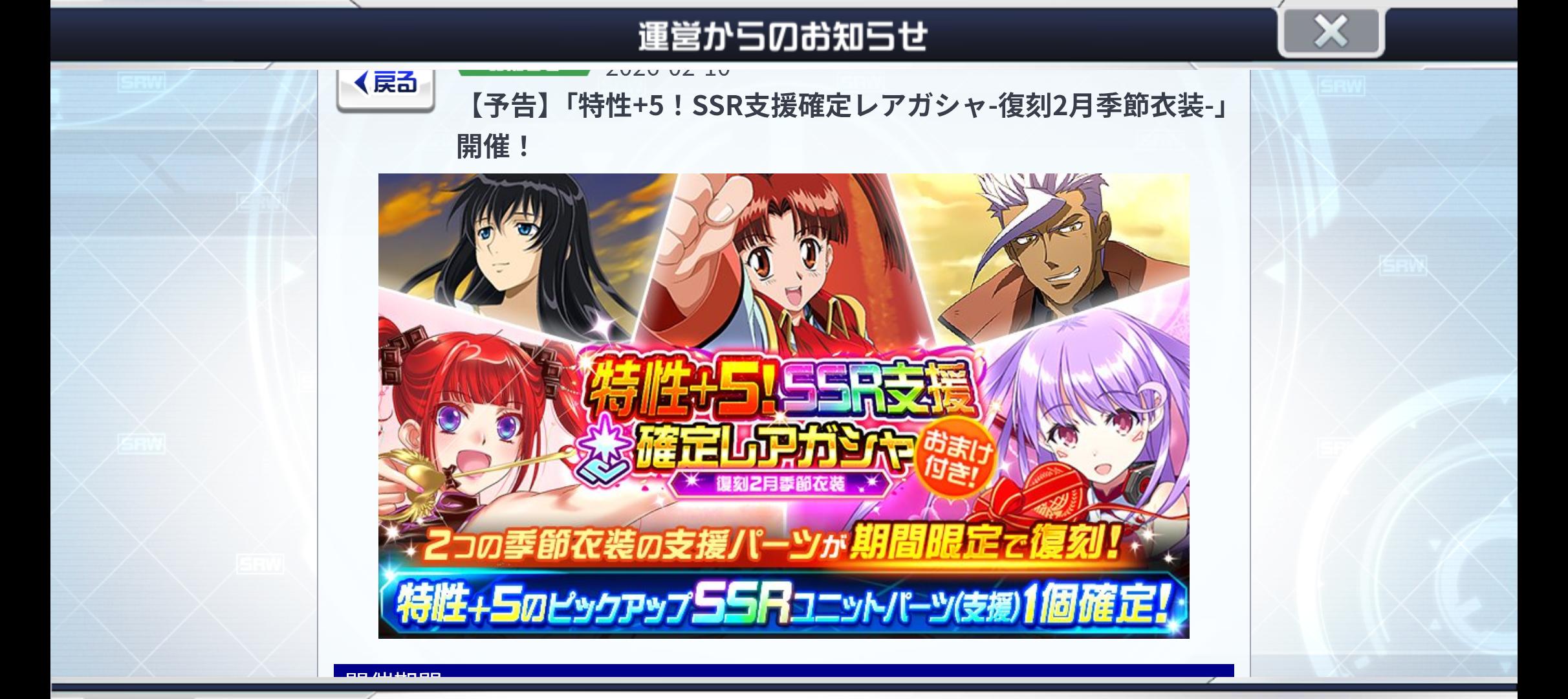 | … | 1726/02/15(日)00:18:53 ID:iV9Rc1CINo.1402108426そうだねx1バレンタイン支援復刻ガチャに何故か団長が混じってるスパロボです |