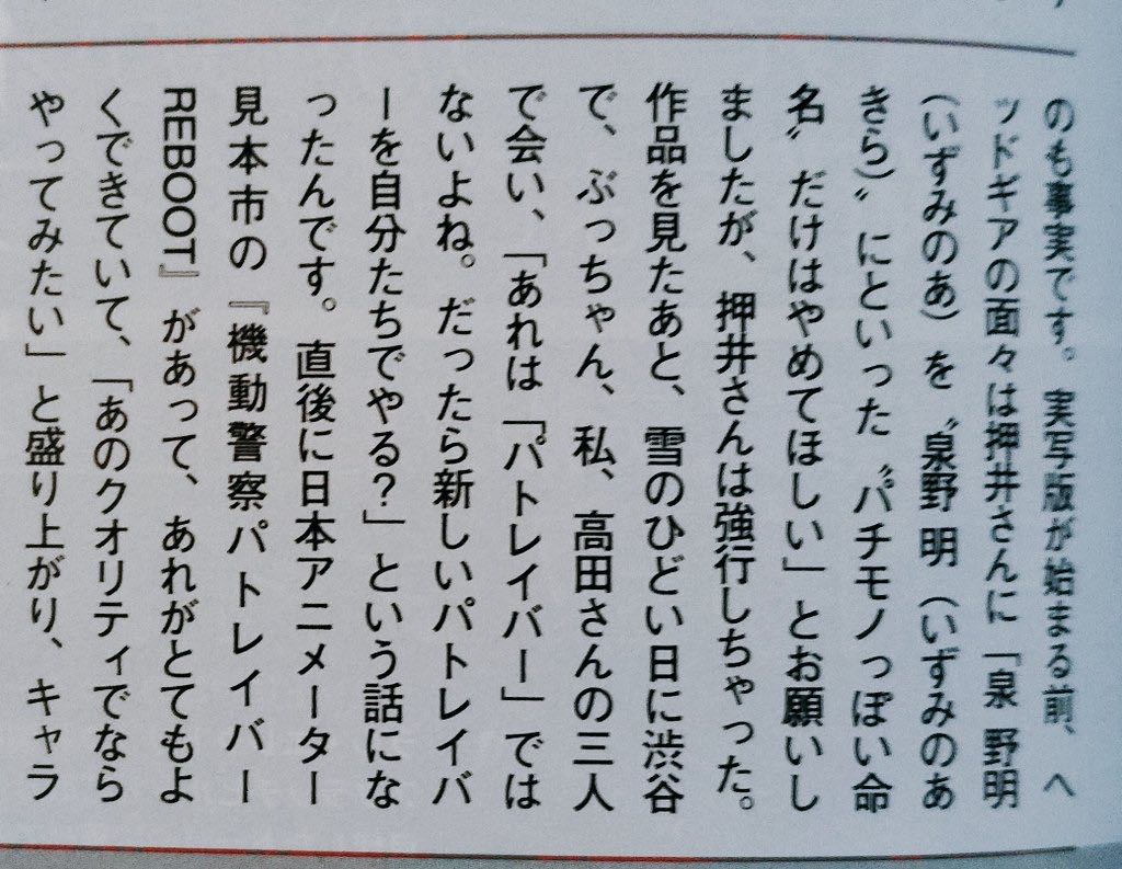 | … | 6326/02/15(日)10:05:18No.1402201891そうだねx1>ヘッドギアが当時干されてた押井守をいいように使ってたのも悪いんですよ |