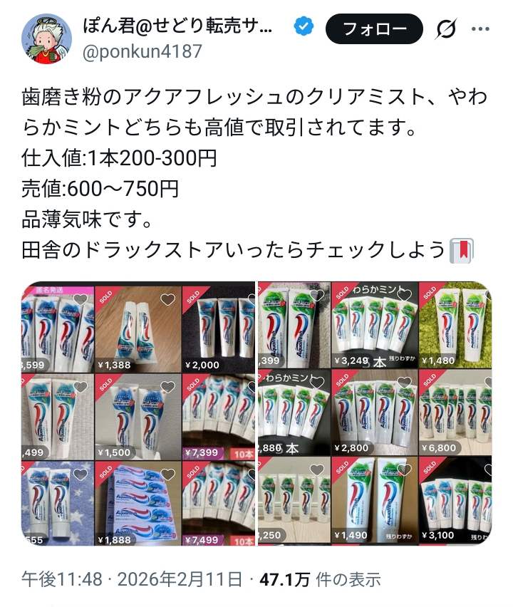 | … | 4226/02/15(日)09:20:30No.1402187962そうだねx2特定の歯磨き粉に固執してる奴なんて少ないだろうし儲からんだろ… |