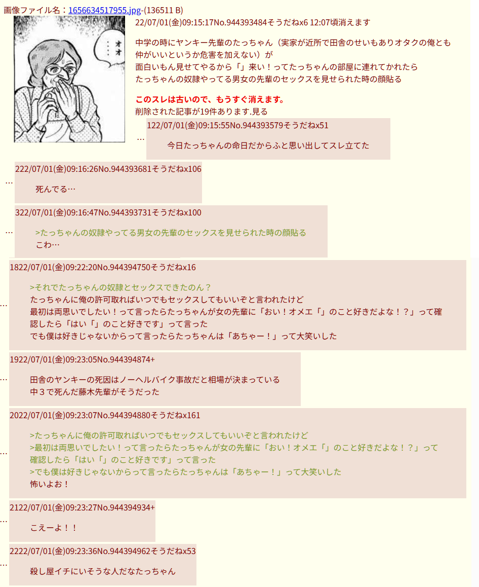 | … | 1726/02/15(日)16:55:37No.1402310059+中学生で先輩の男女ペアの奴隷ってなんだよ |