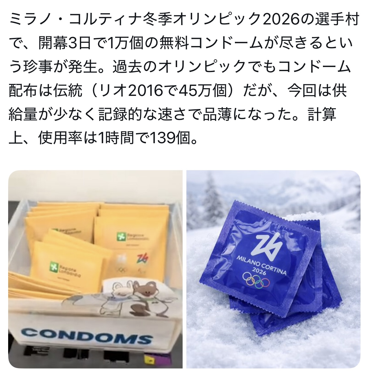 | … | 7326/02/15(日)18:21:40No.1402339873+実際に即使用してる人よりうぉー五輪マーク付いてるパッケージ珍し記念に持って帰ろう絶対ネタになるし |