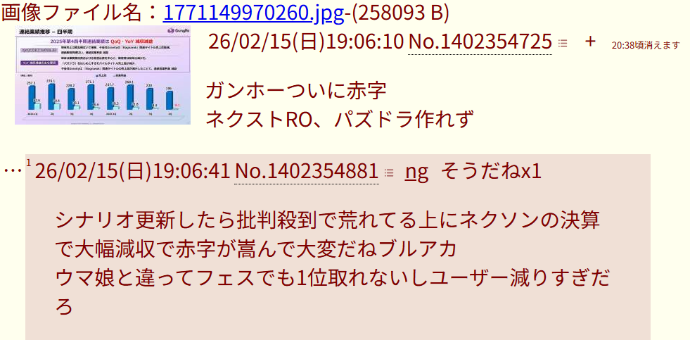 | … | 5526/02/15(日)18:58:37No.1402352180そうだねx5>真面目にブルアカ語れないよねここ |