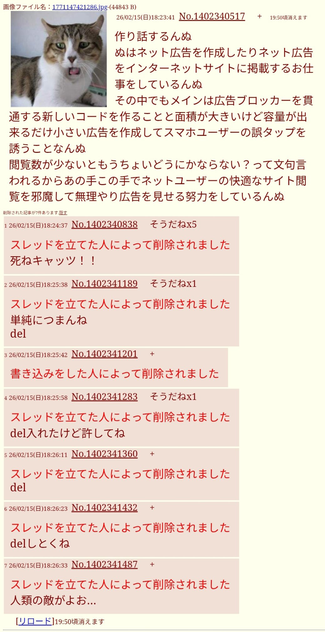 | … | 126/02/15(日)18:30:14 ID:7Y5kCT0oNo.1402342718+AdGuardに見つかったのかもしれん |