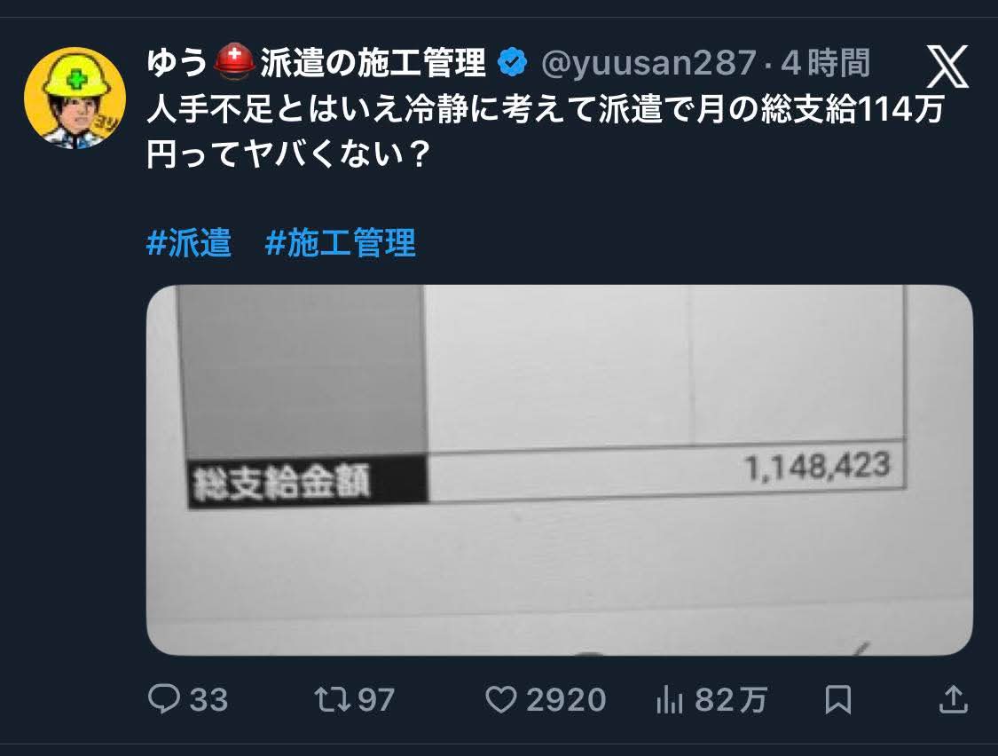 | … | 8426/02/15(日)19:53:37No.1402370742そうだねx1>派遣会社が一番美味しいんでしょこういうの |