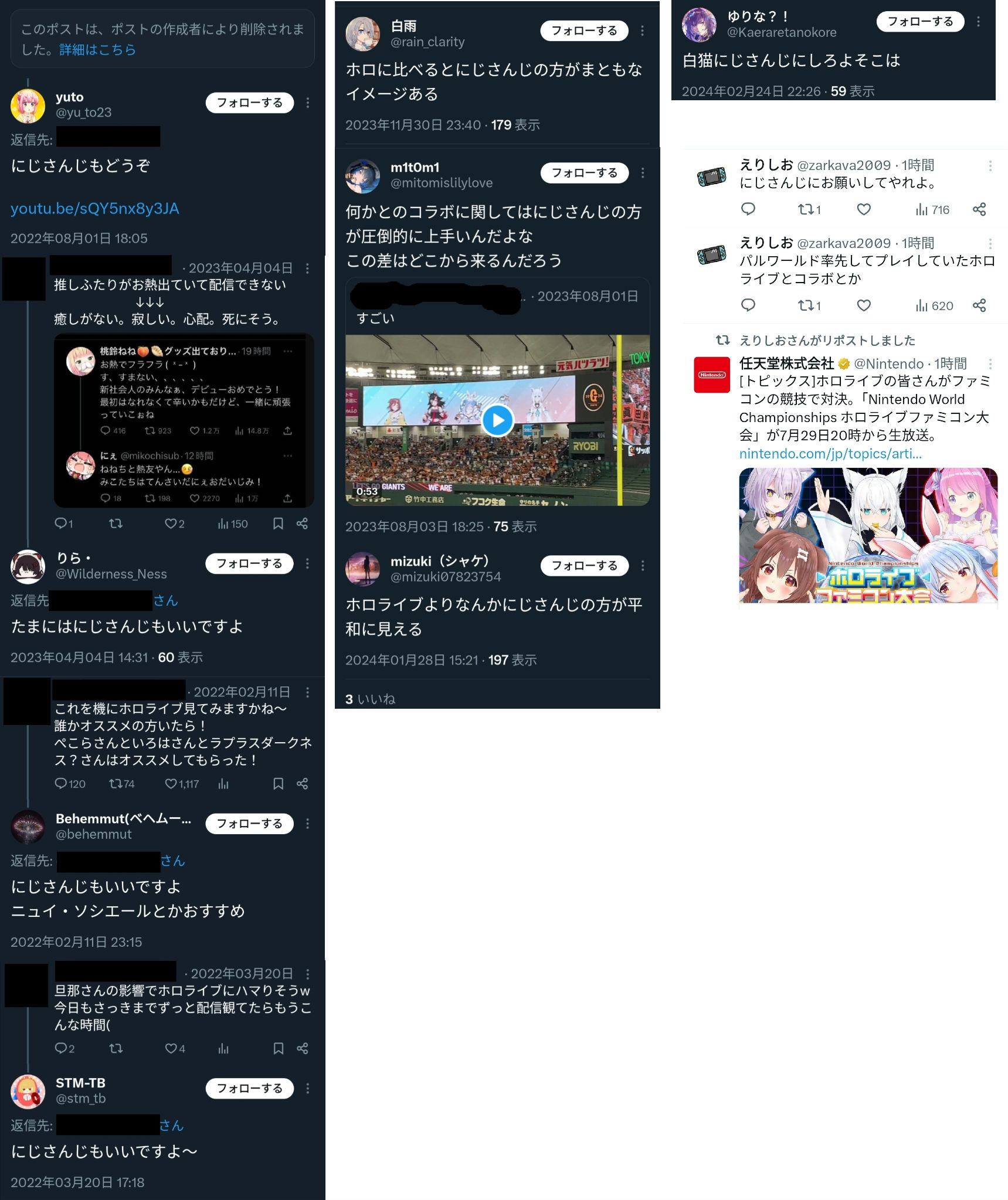 | … | 48526/02/16(月)12:35:58No.1402557399+>>>>にじさんじはホロにできてないポケモンやポケカのあれこれできてるから任天堂と繋がってるし野球試合のあれこれもあったし |
