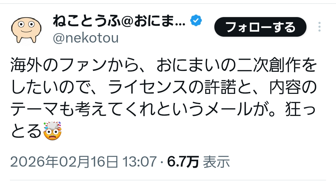 | … | 2026/02/16(月)14:04:29No.1402580757そうだねx11>許諾取ろうとするだけまともなGAIJINに感じる |