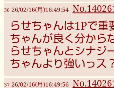 | … | 3626/02/16(月)16:49:54No.1402612593+らせちゃんは1Pで重要度高そうな雰囲気あったけどモモちゃんが良く分からないっス |