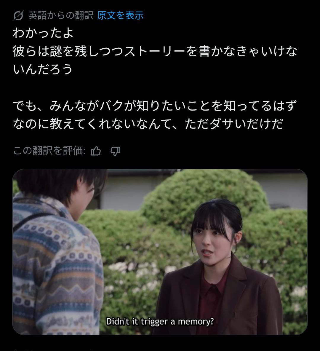 | … | 91326/02/16(月)18:12:36No.1402631509そうだねx1難しい話をしてるんじゃなくて単に話の進みが遅いのと謎が明かされてないだけだからな |
