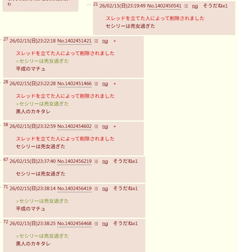 | … | 926/02/16(月)16:46:40No.1402611937そうだねx31>delツール使うってことはにじ豚かよ |