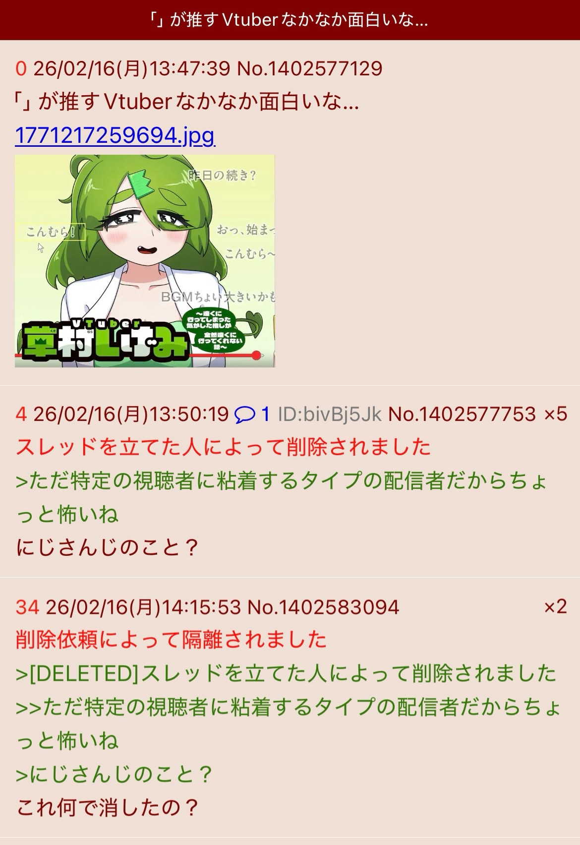 | … | 100026/02/16(月)18:35:48No.1402638918+>削除依頼によって隔離されました |