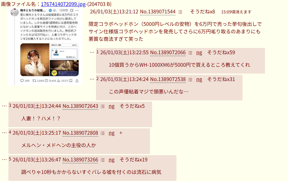 | … | 526/02/16(月)19:28:00No.1402656861+よくわからんけどそんな悪いことしたのかこの声優 |