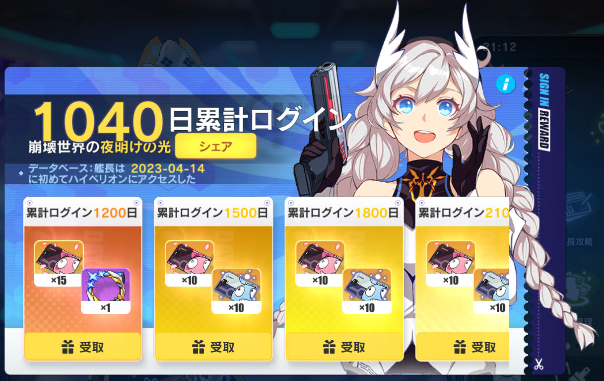 | … | 1626/02/16(月)21:14:23No.1402700882そうだねx4記念に累計ログイン撮ってきた!いつの間にか1000日超えてた! |