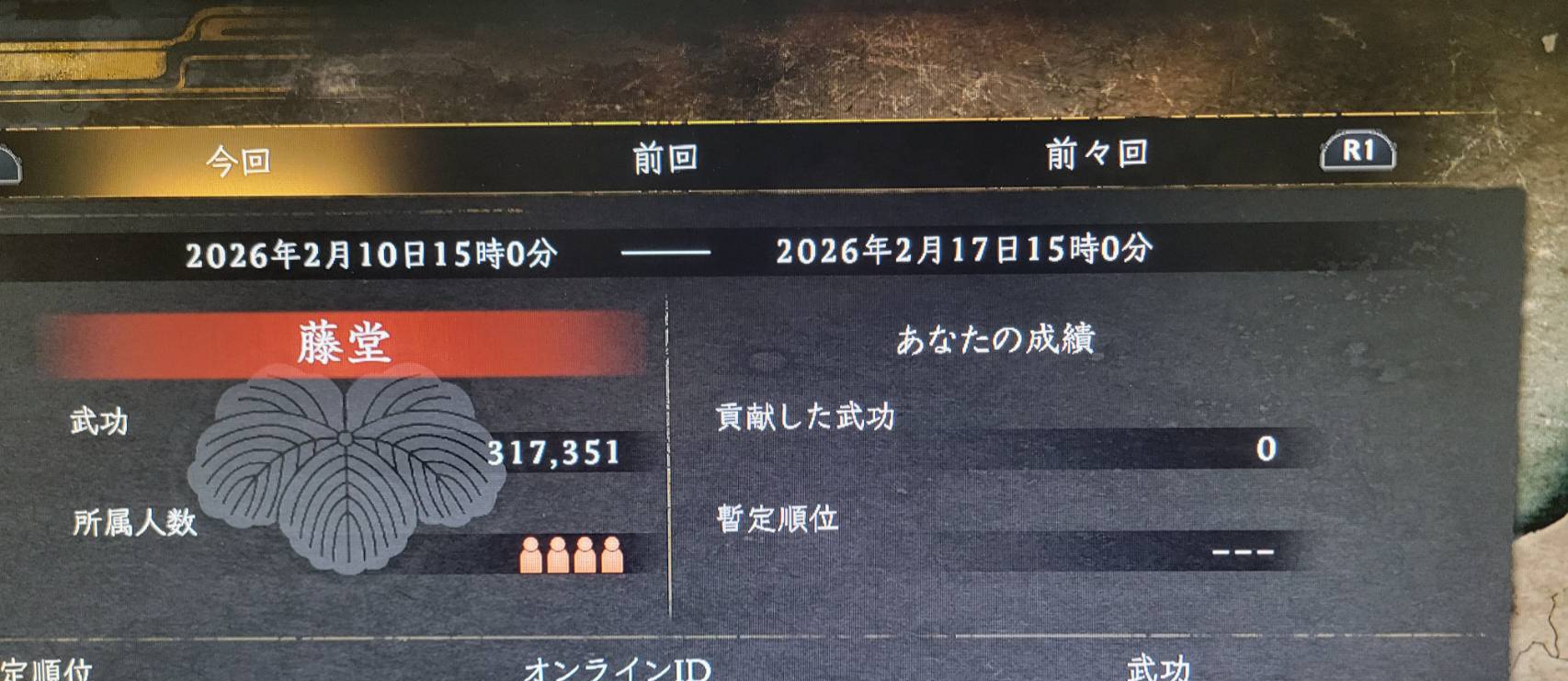 | … | 5826/02/17(火)08:51:14No.1402833125+>俺個人の武功はカウントされて役職も上がってるのに勢力戦での貢献武功はゼロのままだし |