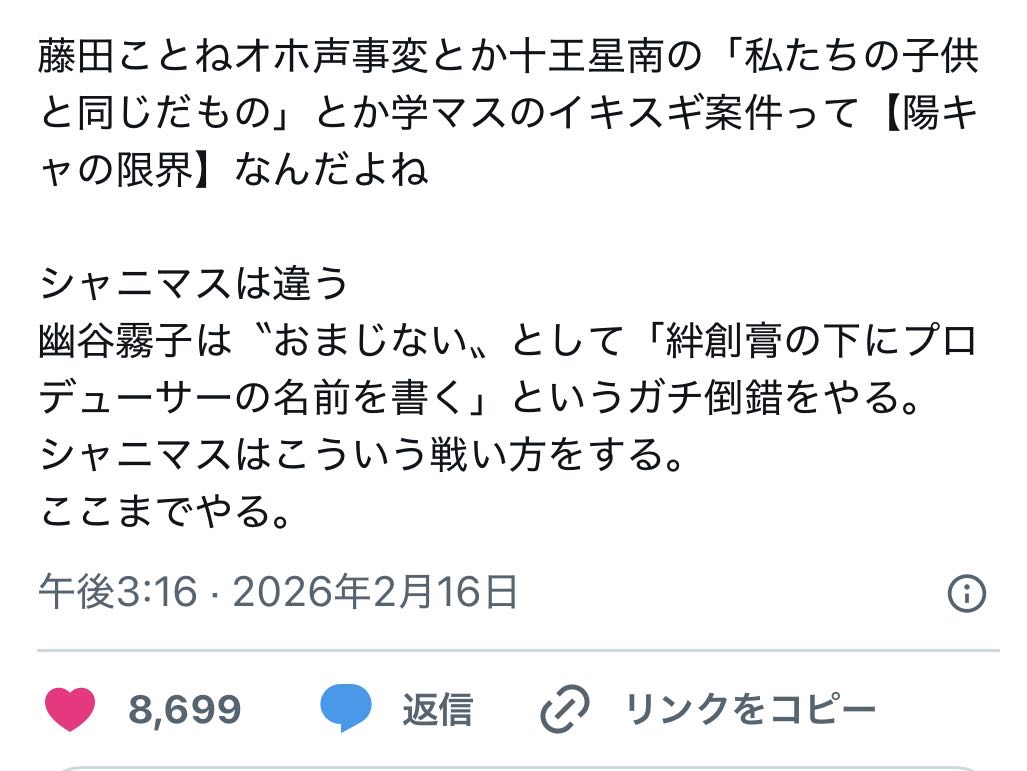 | … | 2526/02/17(火)12:31:19No.1402873565+スレ画みたいな他見下したようなポストがバズる界隈が今のシャニマスなんだよね |