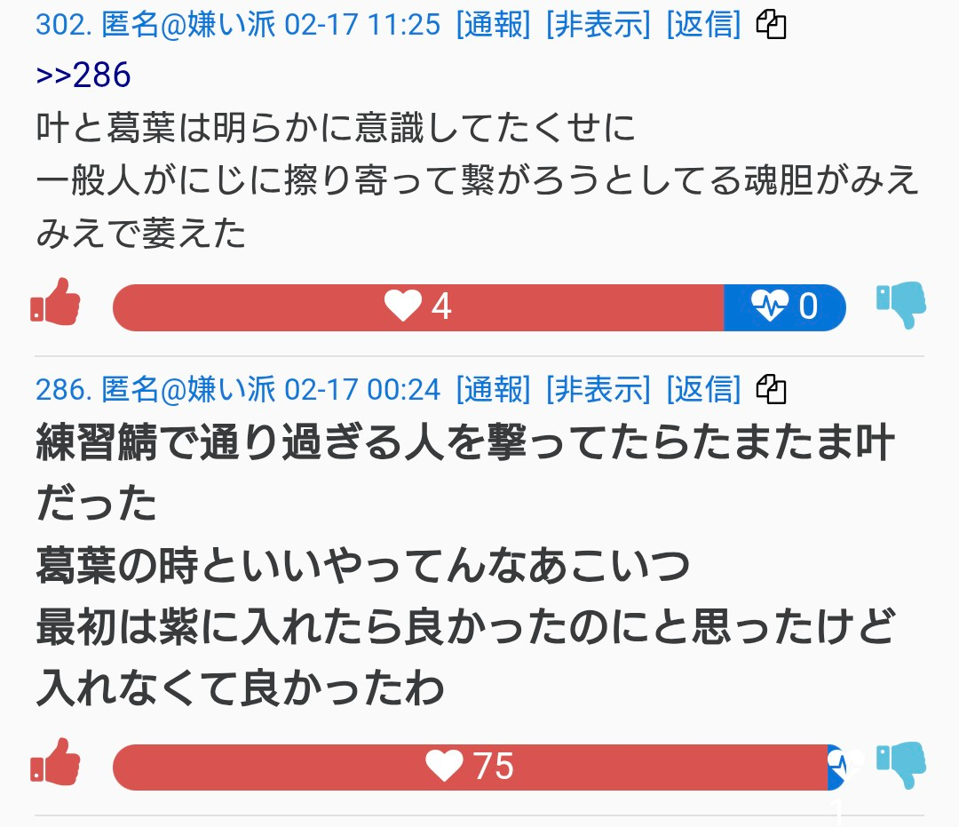 | … | 78326/02/17(火)13:21:52No.1402889298+あにょーwww選挙権がないので政治の話やめてください |