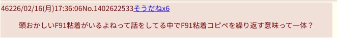 | … | 32826/02/17(火)15:00:28No.1402912007そうだねx3F91について語られるの異常な程嫌うんだなこいつ |