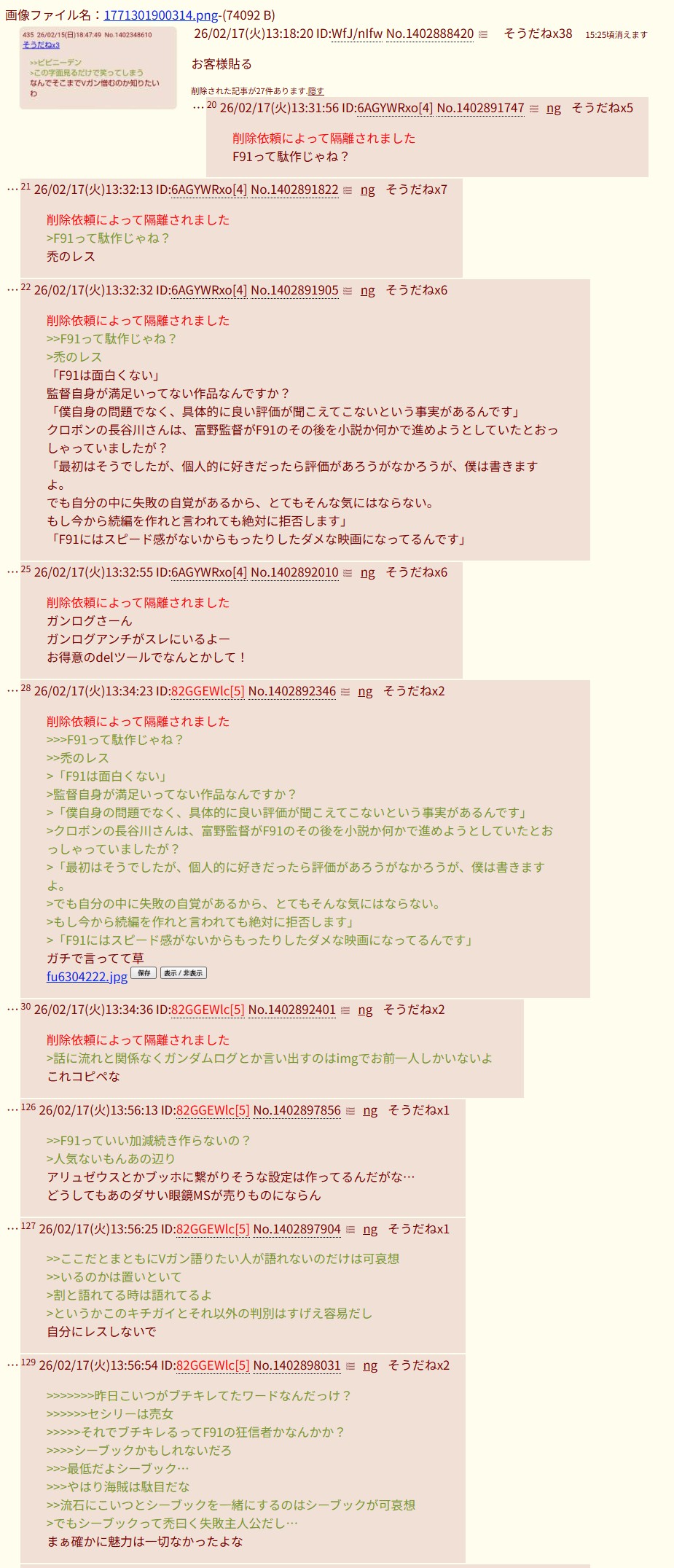| … | 45026/02/17(火)15:26:04No.1402917607そうだねx2>>>F91の話された辺りからスレ豚の殺意が凄い事になってるな |