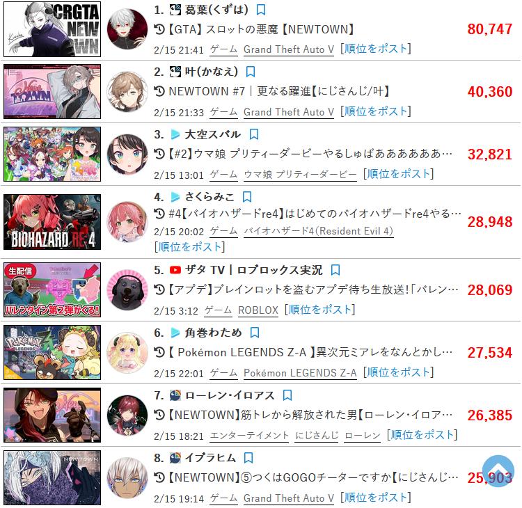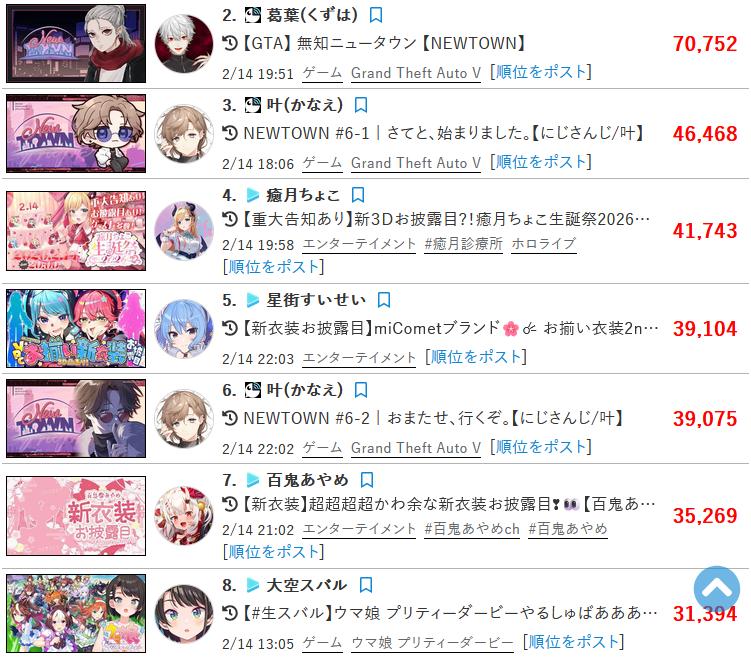 | … | 5126/02/17(火)14:43:03No.1402908391そうだねx9あとはVstatsだと葛葉の高評価数が同接半分以下の配信より更に少なくて |