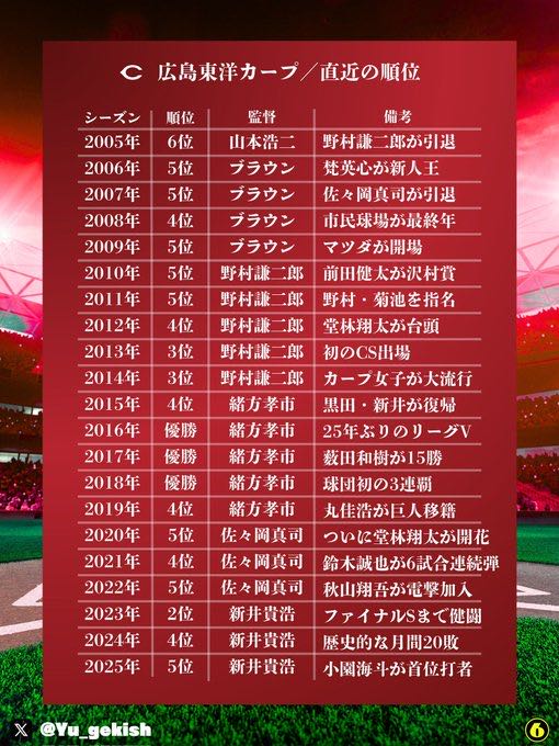 | … | 15426/02/17(火)18:01:11 ID:LYswectENo.1402950125+>4番元山だったチームが直近にあるんやど? |