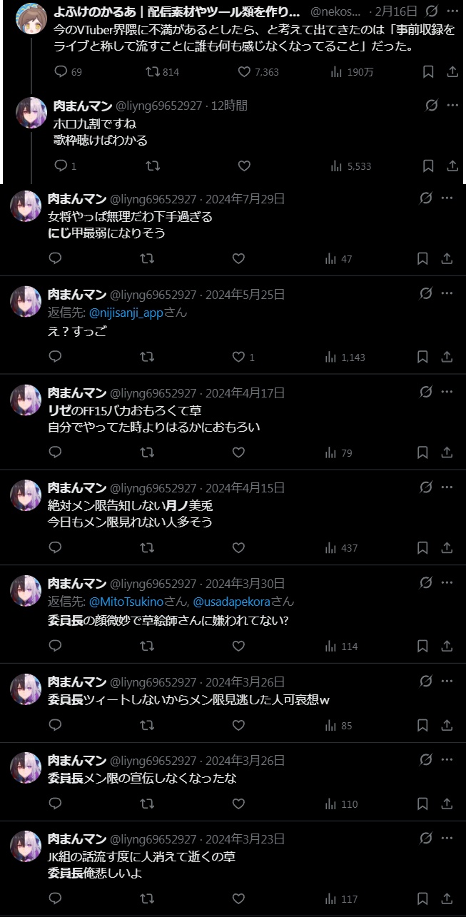 | … | 5226/02/17(火)17:16:14No.1402939360+>にじさんじが録画ライブばかりだから擦り付けてるだけだよ |
