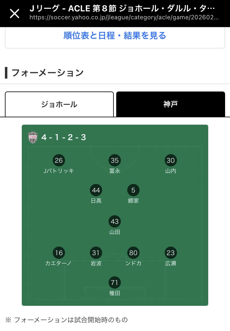 | … | 13026/02/17(火)21:16:43No.1403016042+あれ神戸戦横にフォーメーション出ないんだ |