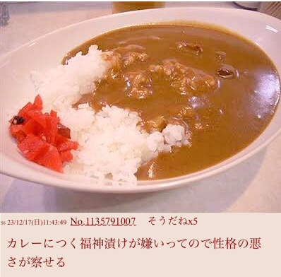 | … | 1426/02/17(火)22:06:26No.1403034097+なんてこった福神漬けなんて乗ってたらご飯に余計な味がついてカレーとの調和が乱れる! |