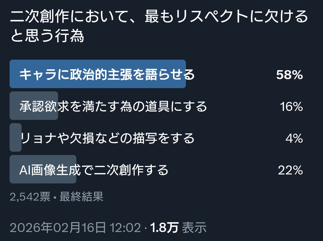| … | 16626/02/18(水)08:56:51No.1403128104そうだねx2リスペクトに欠ける二次創作を選べ(複数選択可)だったら他のにももっと票が入るかもしれないけど |