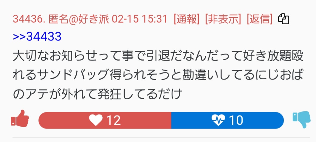 | … | 7926/02/18(水)10:09:26No.1403139564+あからさまに効いているレス引用してコピペしてるのバレてるよ |