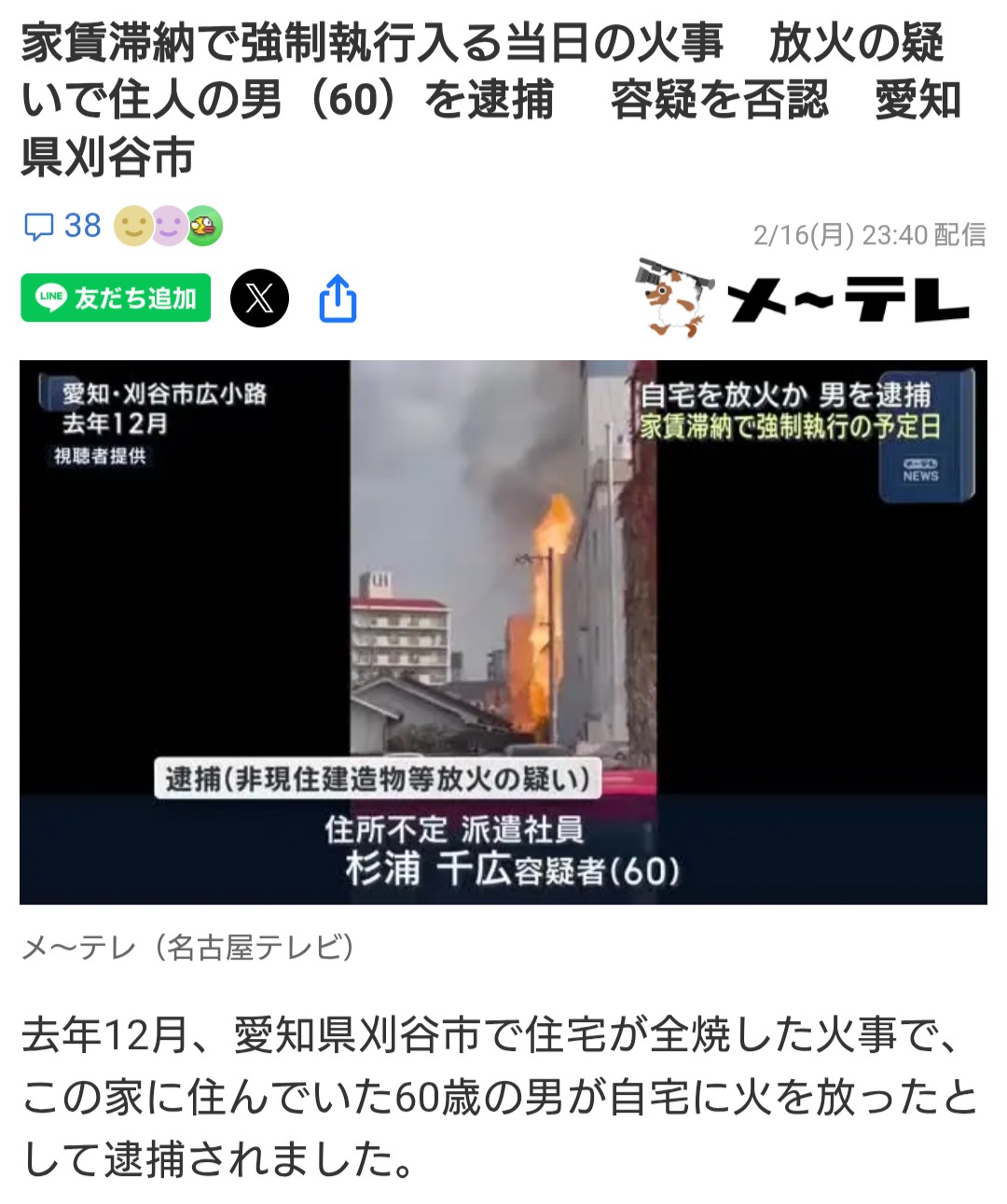 | … | 7226/02/18(水)16:04:33No.1403212664そうだねx1>良くねえよ近隣住民住宅まで全焼死亡してもおかしくないんだぞ |