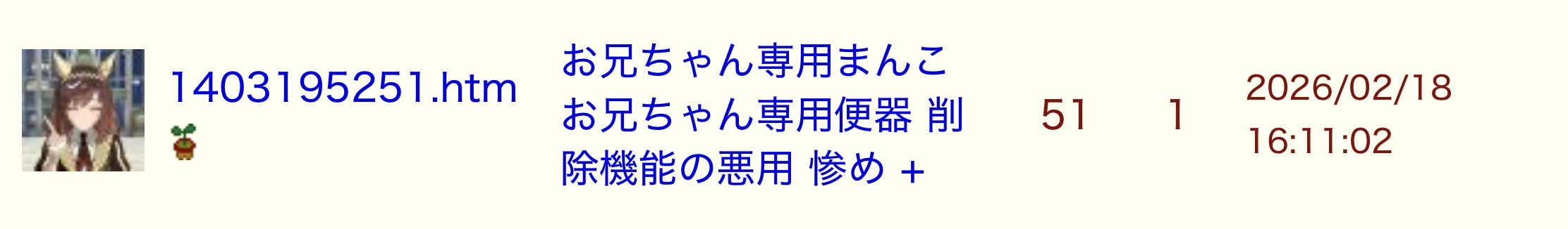 | … | 6026/02/18(水)17:14:54No.1403226306+ウマエロ貼ってそれに対する自演レスなかったな |