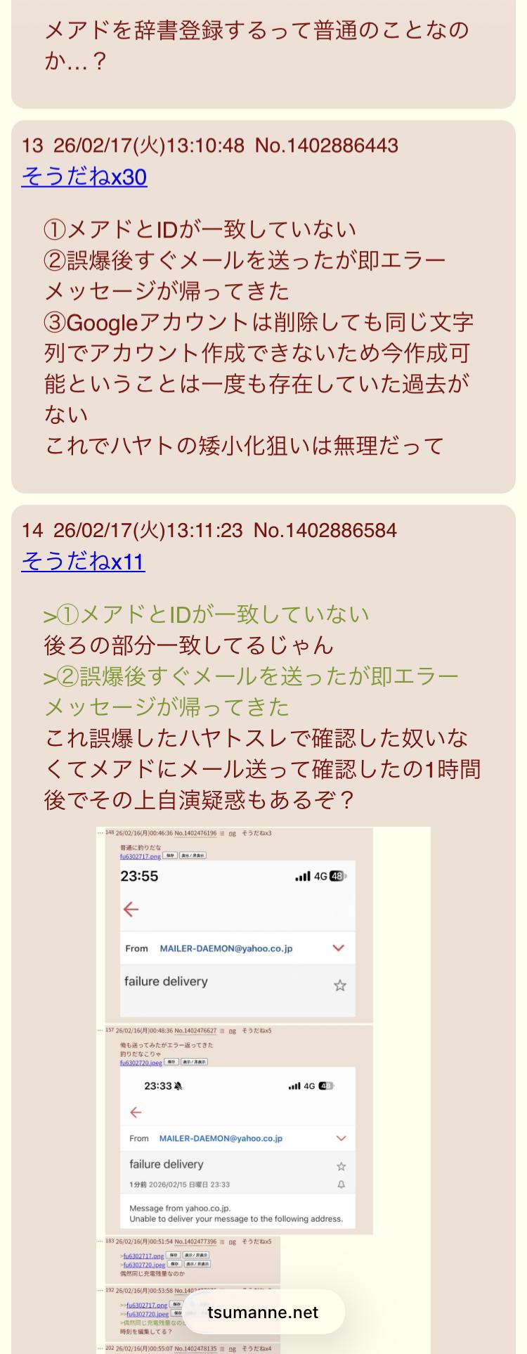 | … | 6026/02/18(水)20:10:18No.1403279609そうだねx4>事前に準備してるから自演は早いんだよねハヤトは |