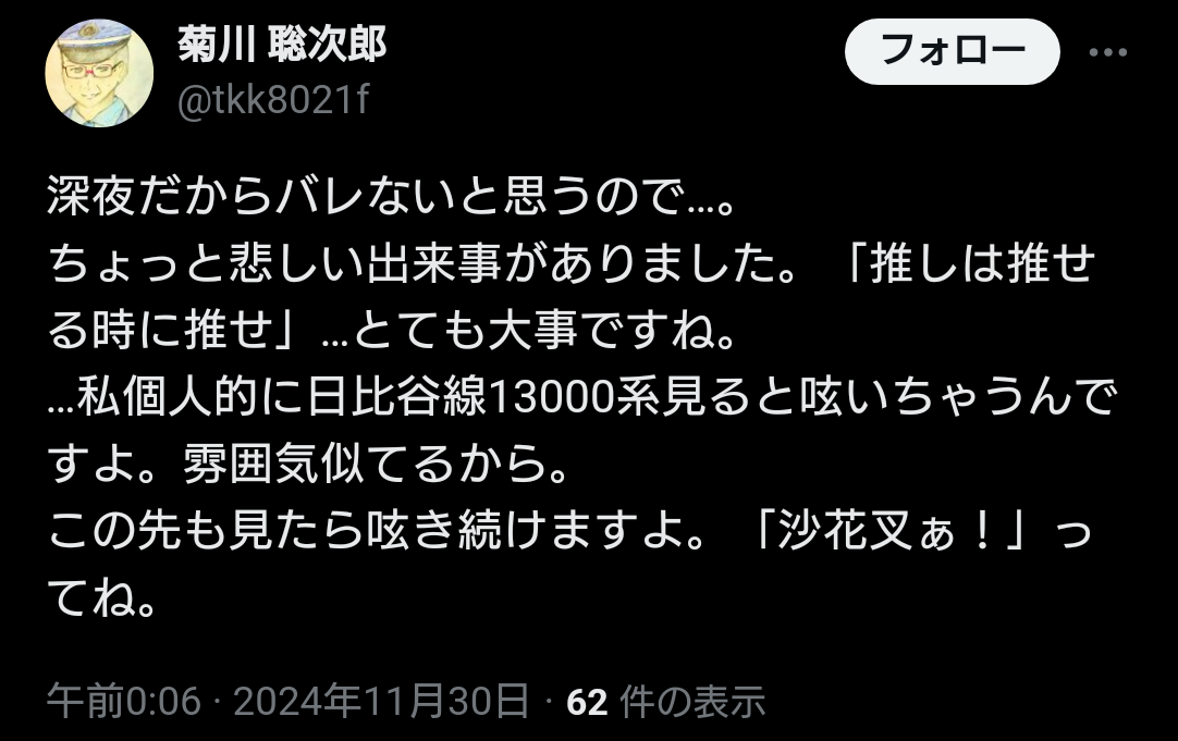 | … | 1726/02/19(木)01:03:32No.1403377447そうだねx3前遭遇した奴はドタドタ走って入ってきてそのままの勢いで電車の先頭にビターン!って引っ付いてずっと車掌の言ってる事復唱してた |
