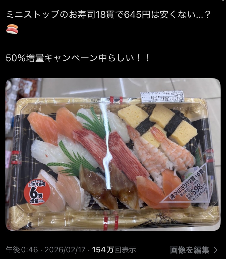 | … | 226/02/19(木)12:05:30No.1403442948そうだねx3>ミニストップで寿司50%キャンぺーン中ですってよ |